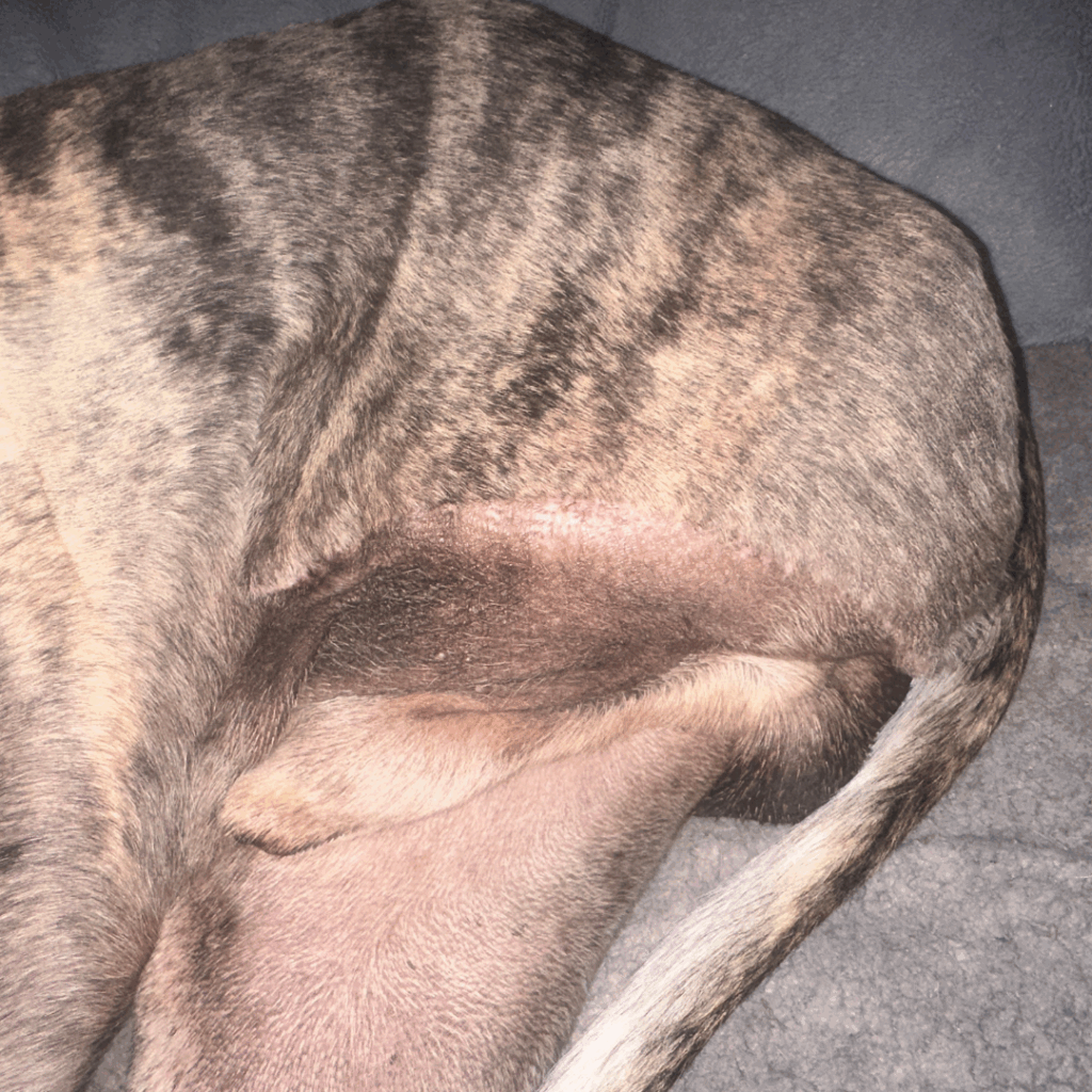 | • Up at 3:00am to pee and went back down no issues. • Slept on his left side with minimal bleeding • Made it to his back at 7:48AM 🥹 • Urinating and drinking lots of water • Ate 1/4 cup of Poop Food • Ate a full bowl of food at 12:15PM • HUGE midnight poop (all on his own) | • Swelling lessened over night • Same spot on the incision still oozing with pressure / movement • No apparent odor or color changes in discharge • Continuing to clean with Chlorhexidine wipes after every outing |